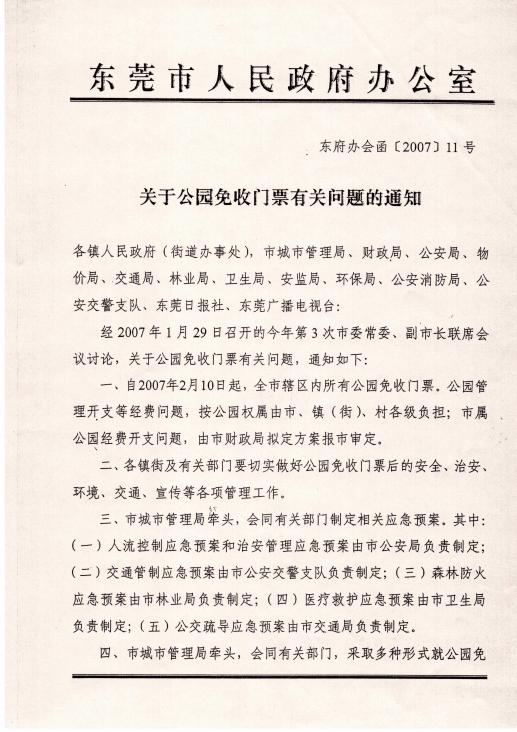 2007年1月,东莞市人民政府办公室在市委书记刘志庚等人的授意下下发了《关于公园免收门票有关问题的通知》(东府办会函〔2007〕11号)。在没有征求观音山公园意见,也没有任何针对性的经费保障措施和实施方案的情况下,猝然通知观音山公园停止收取门票。