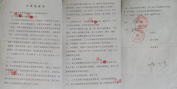 2009年1月1日,宁阳县葛石镇黑石村(黄家峪自然村)与山东泰山鑫磊机械拖拉机制造有限责任公司(后变更为山东泰山鑫磊机械制造有限公司)签订了“荒山荒坡,农副产品精深加工、农林业观光等多项目综合开发利用”的开发协议,流转黑石村500亩荒山荒坡,承包期至2058年12月30日。合同明确约定,合同期间如遇不可抗拒的政策变化及自然灾害时,双方协商解决,不因以双方法人代表变动而变更,任何一方不得随意终止合同。合同到期后,地上附着物按当时现行评估价,甲方有优先购买权,甲方付给乙方土地治理补偿费用,价格协商解决,或经人民法院按国家法律法规裁决。