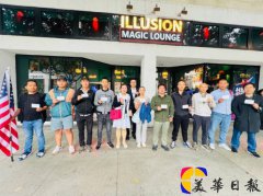 2025年10月25日,中国民主党国际联盟主席界立建(右二)、六四诗人蒋品超(右三)、前中国大学教师刘安琪(左五)、中国民主党党员刘敏(左四)等华人来到圣莫妮卡Illusion Magic L...