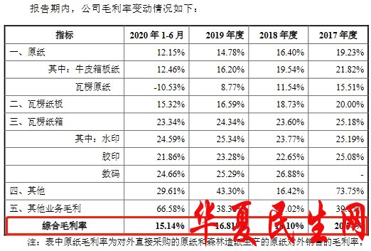 2017年至2020年1-6月,森林包装综合毛利率呈逐年下滑趋势,分别为20.54%、18.10%、16.81%、15.14%。分产品来看,报告期内,公司原纸产品(牛皮箱板纸和瓦楞原纸)毛利率分别为19.23%、16.40%、14.78%和12.15%;瓦楞纸板毛利率分别为20.00%、18.73%、16.59%和15.32%;瓦楞纸箱毛利率分别为25.18%、23.60%、24.34%和23.34%。可见,报告期内,主要产品中原纸和瓦楞纸板的毛利率呈现小幅下降趋势,瓦楞纸箱的毛利率则较为平稳。