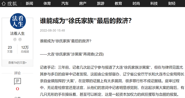 “徐氏家族”的事,有多家媒体包括记者本人前去大连进行了采访报道,目前在搜狐、腾讯等多家网站还能查到关于此事的文章,但是,内容都是一样的,原因是来自一个通稿,当时辽宁的新闻主管部门不允许记者想写自己要写的东西。但尽管这样,这些报道列举的罪状当中,没有一条能与国家和辽宁省定的那些“涉黑条款”能对得上的,参与报道的记者有一个共识:“就这些内容,加个‘黑家族覆灭记’的大标题,实在有些脸红”。