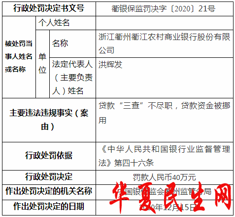 中国经济网北京12月22日讯 银保监会官网今日披露的中国银保监会衢州监管分局行政处罚信息公开表(衢银保监罚决字〔2020〕21号)显示,浙江衢州衢江农村商业银行股份有限公司(以下简称“浙江衢州衢江农商行”)贷款“三查”不尽职,贷款资金被挪用。