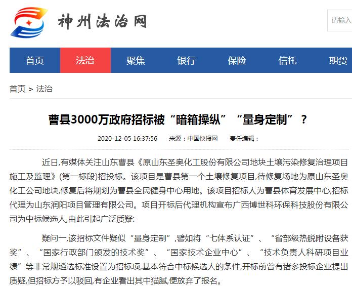 近日,有媒体关注山东曹县《原山东圣奥化工股份有限公司地块土壤污染修复治理项目施工及监理》(第一标段)招投标。该项目是曹县第一个土壤修复项目,待修复场地为原山东圣奥化工公司地块,修复后将规划为曹县全民健身中心用地。该项目招标人为曹县体育发展中心,招标代理为山东润阳项目管理有限公司。项目开标后代理机构宣布广西博世科环保科技股份有限公司为中标候选人,由此引起广泛质疑:
