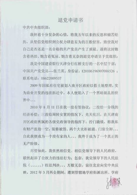 天津维权人士张兰英原是中国建设银行的一名中层管理人员,因自家房屋被南开区政府强拆强占而维权,在当局的迫害下使其家破人亡。2014年7月,张兰英先是向以邮寄信件的方式向中共党组织发送退党申请书,后又以视频和文字等不同方式在公开场合发表《退党声明》。2015年,张被当地法院以莫须有罪名判囚三年,2018年1月,张兰英服刑期间她的父亲含冤去世,至今仍冰冻在殡仪馆无法下葬;2018年8月8日,张兰英刑满释放后得知中国建设银行早已将其除名。目前张兰英仍有九十岁老母无人照料。