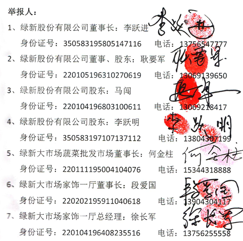 我们叫李跃进、段爱国、耿要军、马闯、何金柱、李跃明,我们特向贵委实名举报李申学、王庭凯、马国成、刘洪伟为假警察王文贵充当保护伞,合谋私分国有资产的犯罪行为。