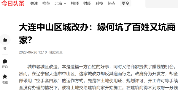 在旧城改造中,为了保障市民能顺利回迁,政府部门作为开发方是无可厚非的。但是,既然是开发方,就得将土地使用证、规划及开工许可等手续全部办下后,才能招标建筑方。可是,大连中山区城改办却玩起了“空手套白狼”的手法,在什么手续都没有的情况下,便私下将开发地块交给了一家名叫“大连海川建设集团”的公司开始承建。双方约定,一切施工款全由施工方“大连海川”来垫付,当工程竣工后,用建成的商品房来支付工程款。身为建筑方的“大连海川”胆子也够大,凭着自己与政府合作多次而没有半点怀疑就接下了这个工程,但是,自己资金有限,没干多久便只好去民间高利融资,先后从个人手中融来一个多亿,在连利息都还不上之后,这些人将“大连海川”告上法庭。欠债还钱理所应当,法院很快支持了这些市民的诉讼请求,并查封了“大连海川”与政府约定抵工程款的9000多平方米当中的1300平方米商品房,此时是工程开工第二年2013的事。